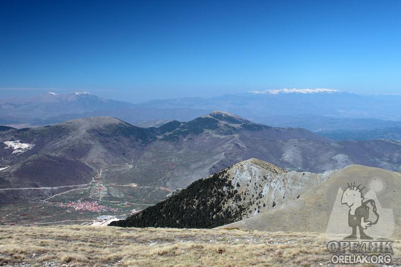 | Селцето Волак и над него Шилка и Весеник. В далечината Алиботуш и Пирин - панорама от Момин връх |