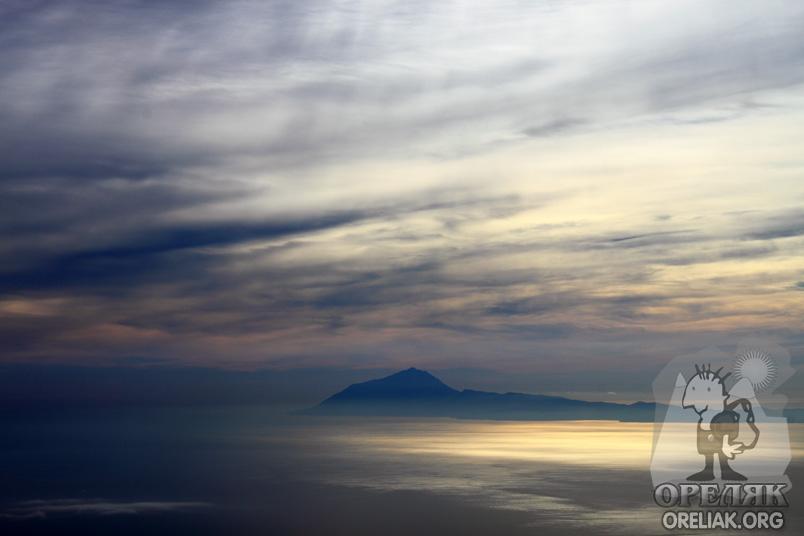 Огра на облаци и слънчеви лъчи. В дъното в. Атон, на едноименния полуостров, който наподобява остров в морето.