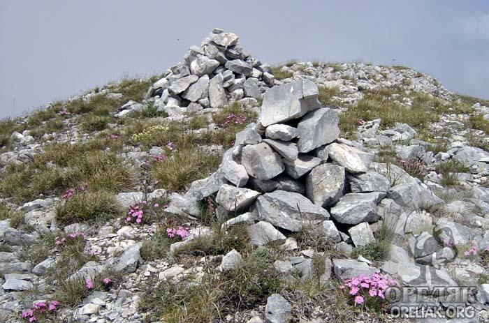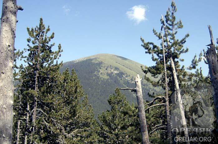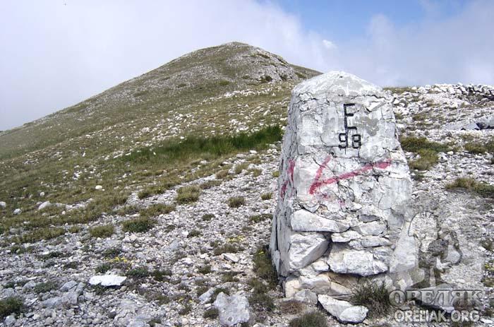 Граничната пирамида при връх Шабран. Самата кота е в България
