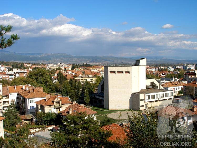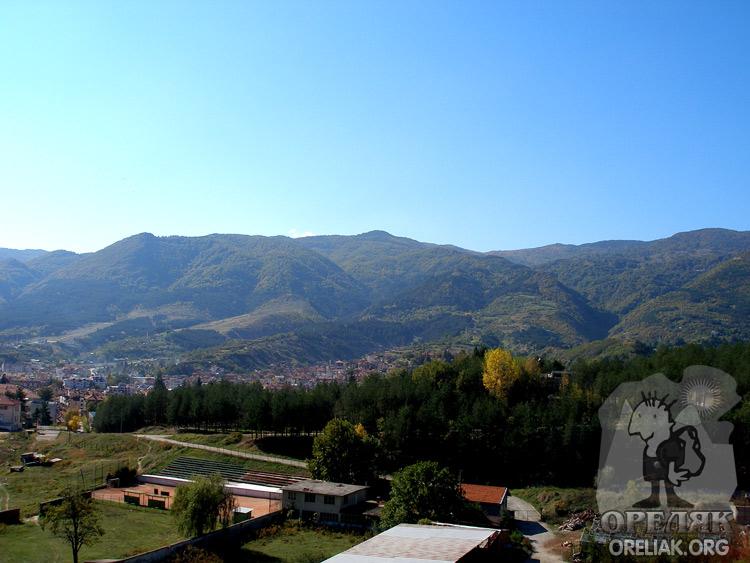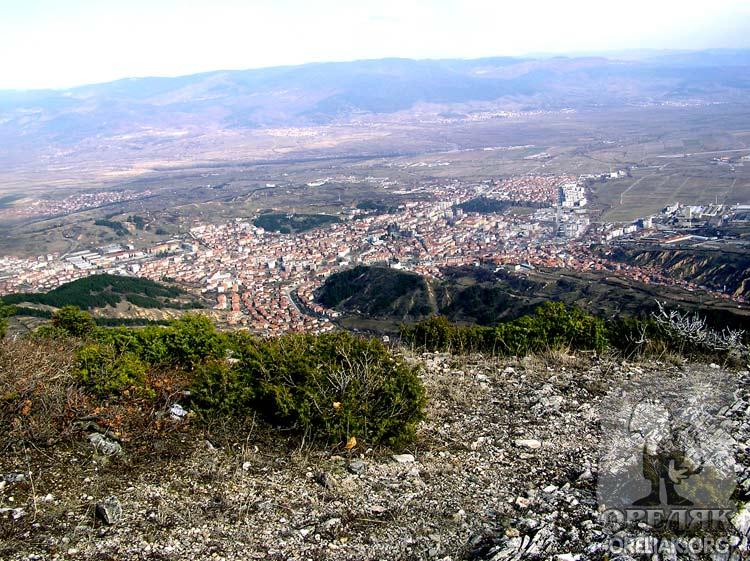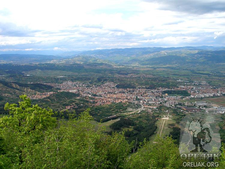 | Градът гледан от местността Горилата. В близост се вижда игрището за хандбал, а в дъното няколко върха в Южен Пирин. |