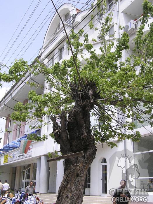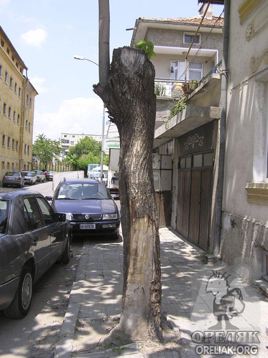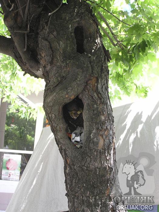 | Трети ще се борят още няколко години в стремежа си за живот, а дотогава може да ни дават още някоя глътка чист въздух и прогнилите им сърцевини могат да се използват за други цели като например “живи кофи за боклук”! Какво по-приятно нещо от това да се повдигнеш на пръсти и да пъхнеш полиетиленовата торбичка, в която до преди малко си съхранявал купените от близката лавка баничка и боза, в това толкова интересно “кошче”. Не стои ли красиво!? Ако някой си мисли, че в тези хралупи катерички могат да направят новия си дом или двойка птици да свие гнездо много се лъже. Това не е гората, а улица където се провежда седмичния пазар. По-вероятно е да видите заковани пирони, на които да висят всевъзможни пазарни артикули, завързан винкел на нечия сергия за да не падне от вятъра или полиетилена, който я предпазва от дъжд. Да, човекът е изобретателно същество. На всичко ще му намери предназначение.